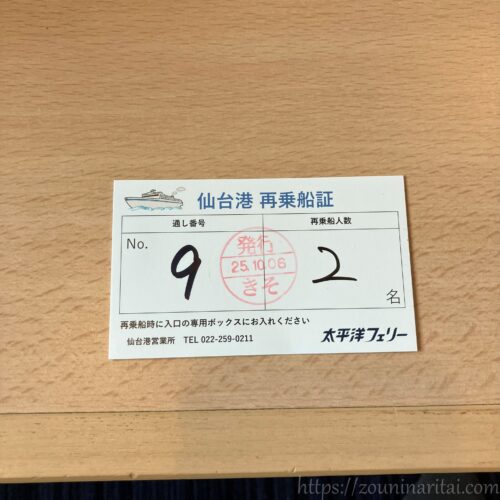 書類を提出すると、「再乗船証」がもらえます。一時上陸したあと再度乗船する際にはこの再乗船証が必要となります。搭乗券(紙・QR)ではなく再乗船証が求められるので、船を降りる際にはこちらを忘れず持っていきましょう。